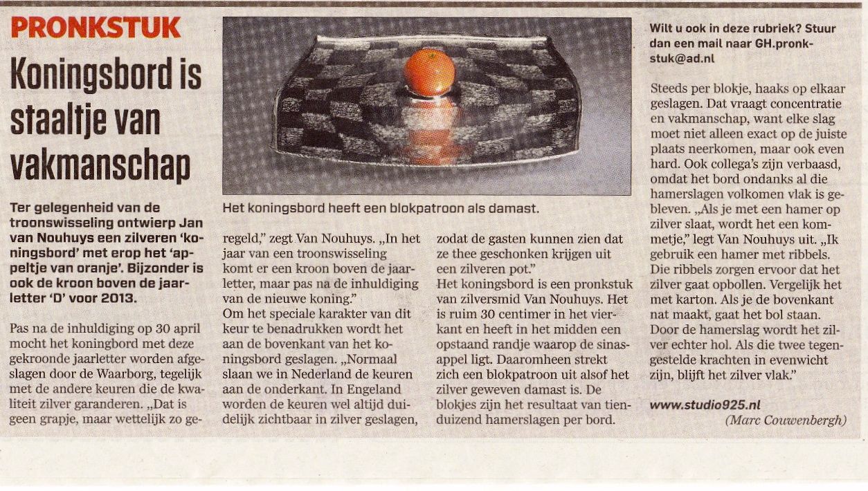 In the Algemeen Dagblad Groene Hart edition of 8 May 2013 an article written by Marc Couwenbergh has been published about the "Koningsbord" that Jan van Nouhuys specially designed and made for the occasion of the inauguration of Willem Alexander as king.