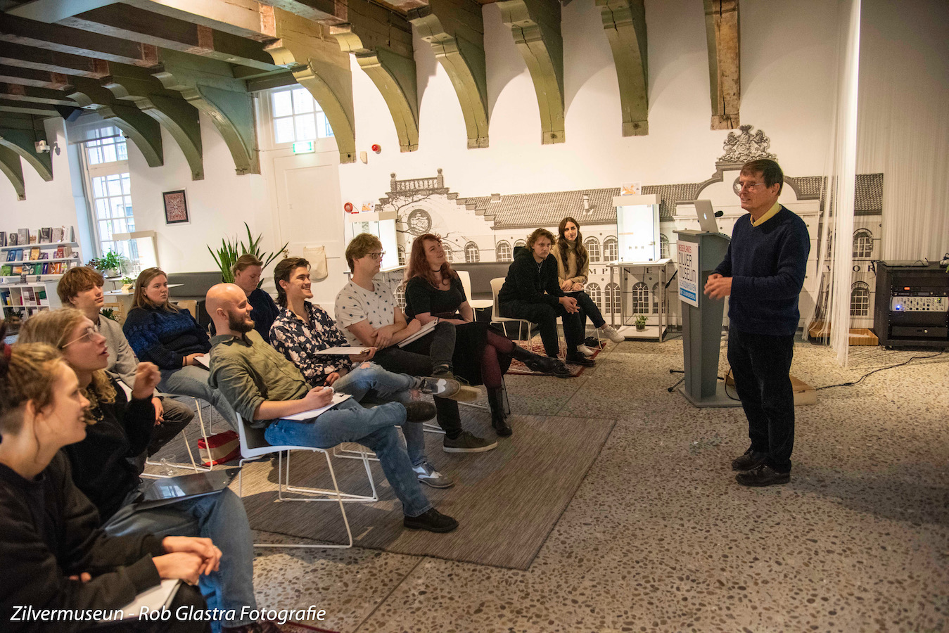 As part of the ongoing exhibition Ground Hope at the Silver Museum, Danika Halley, trainee working at the museum, organized a lecture and tour by Jan van Nouhuys for the students of the Vocational School for Gold, Silver and Clockworks (Vakschool) in collaboration with one of the students.